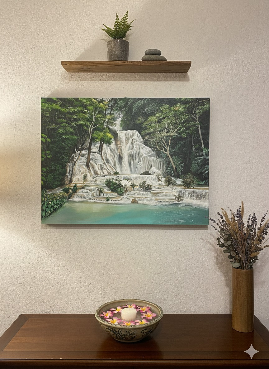 ຮູບແຕ້ມນ້ຳຕົກຕາດກວາງຊີນີ້ຈະຊ່ວຍສ້າງບັນຍາກາດທີ່ສົດຊື່ນ ແລະ ສະຫງົບງຽບໃຫ້ກັບທຸກພື້ນທີ່. ບໍ່ວ່າຈະວາງໄວ້ໃນຫ້ອງຮັບແຂກ, ຫ້ອງນອນ, ຫຼືຫ້ອງການ, ມັນຈະເຮັດໃຫ້ທ່ານຮູ້ສຶກເໝືອນໄດ້ຢູ່ໃກ້ກັບທຳມະຊາດ.